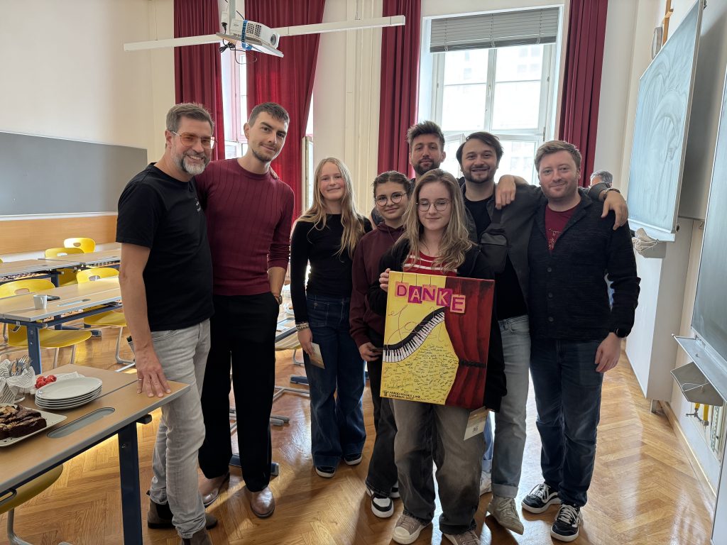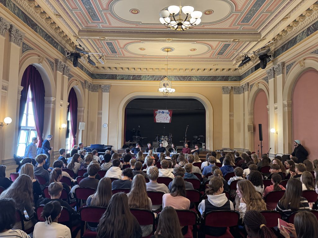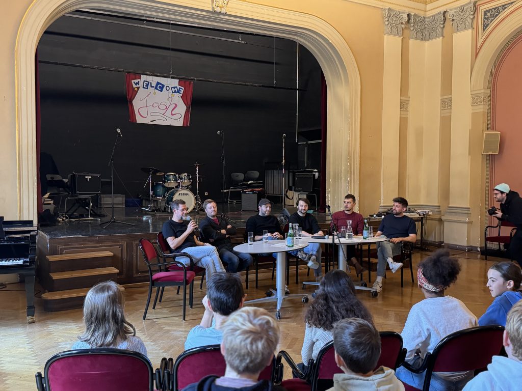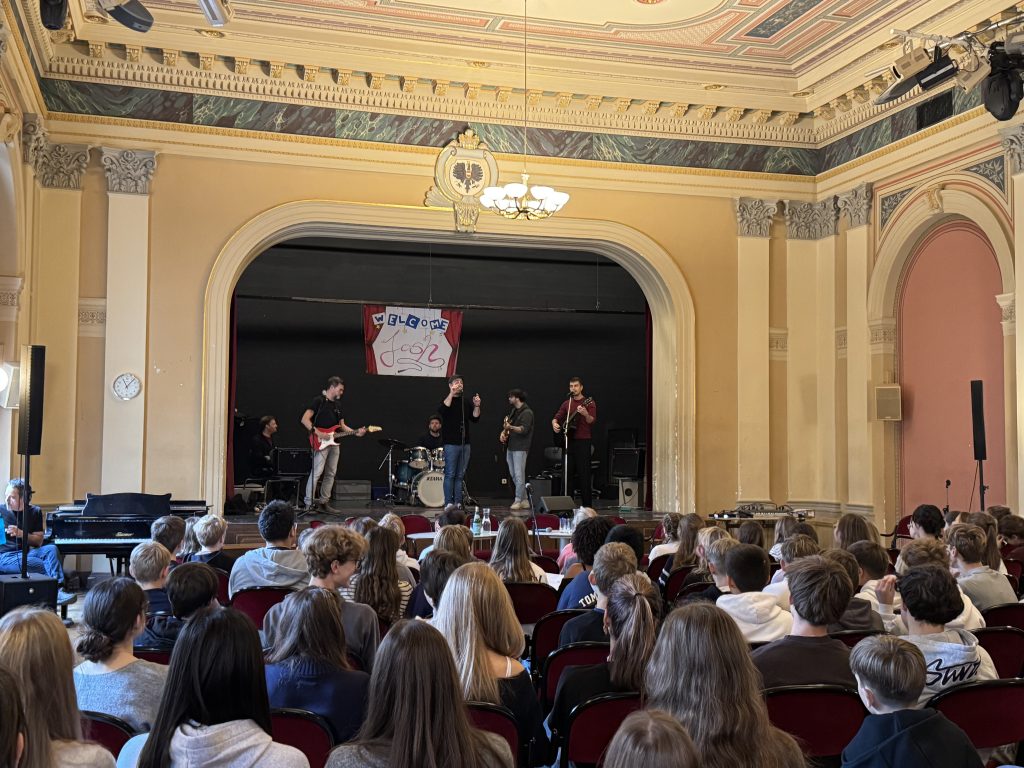 Im Anschluss nahm sich die Band Zeit für ein offenes Fragegespräch. Die Schülerinnen und Schüler nutzten die Gelegenheit, um mehr über das Musikerleben, Songwriting und den Weg zum Erfolg zu erfahren. Die Musiker antworteten sympathisch, ehrlich und mit viel Humor – die Begeisterung im Raum war spürbar.