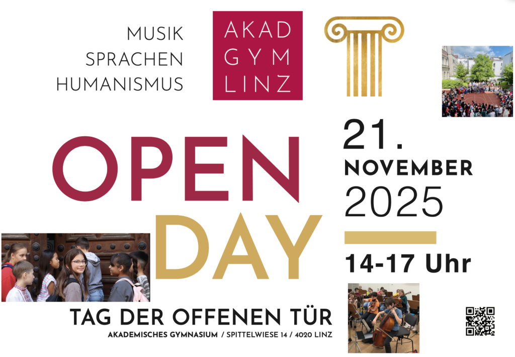 Das Akademische Gymnasium Linz lädt herzlich zum Tag der offenen Tür am Freitag, den 21. November 2025, von 14:00 bis 17:00 Uhr ein.